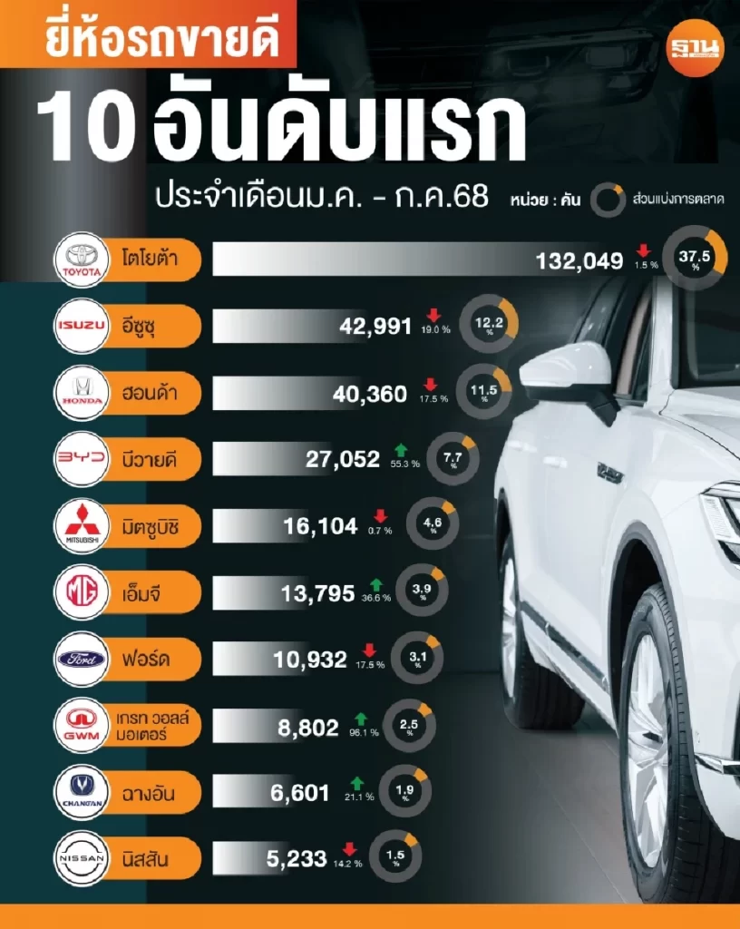 در ماه ژوئیه ۲۰۲۵، بازار خودرو تایلند در مجموع ۴۹,۱۰۲ دستگاه فروش داشت که ۵.۸٪ رشد را نسبت به سال گذشته نشان می‌دهد. بخش خودروهای سواری رشد ۱۳.۳٪ داشت و به فروش ۱۸,۷۶۰ دستگاه رسید، در حالی که خودروهای تجاری با ۳۰,۳۴۲ دستگاه فروش تنها ۱.۷٪ رشد کردند. اما بازار وانت‌های یک‌تنی با فروش ۱۴,۸۴۲ دستگاه همچنان افت ۸٪ را تجربه کرد.